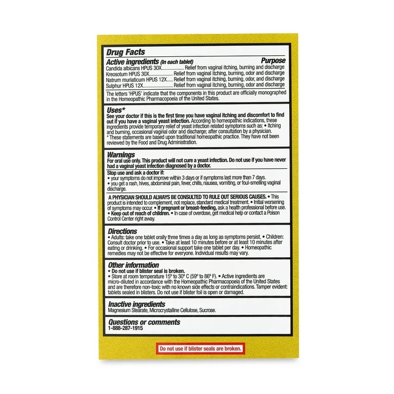 Get fast relief with Equate Yeast Relief! Yeast Relief is made with the same high quality active ingredient as the leading national. This tablet provides multi symptom relief for symptoms of yeast infections, vaginal itching, burning and occasional odor and discharge. Made from homeopathic ingredients, these tablets have no drug interactions and no side effects, so you can feel good about taking them. With 60 tablets in each bottle, you’ll have plenty for the relief you need. Check out other Equate products to help you be prepared when you need them like first aid kits, vitamins, pain relief, and more. Bring home the Equate Yeast Relief today, so you can get back to normal quicker.